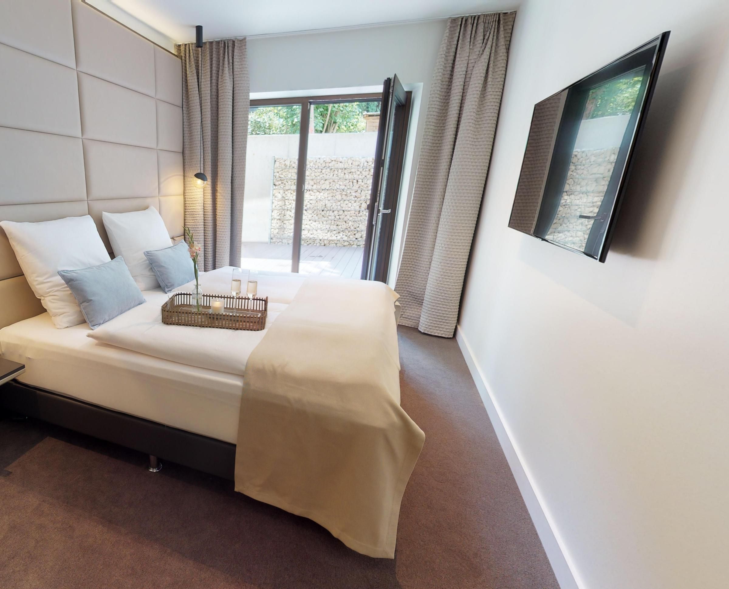 Im Untergeschoss befinden sich drei Schlafzimmer mit Boxspring-Doppelbetten - jedes Schlafzimmer hat Zugang zur großen, möblierten Terrasse. Ergänzt wird das Untergeschoss durch zwei luxuriöse Bäder mit Dusche sowie einer eigenen Sauna (2,37m x 1,19m). Vom Untergeschoss aus gelangen Sie auch in die Tiefgarage. Zur Wohnung gehört ein Tiefgaragenstellplatz.