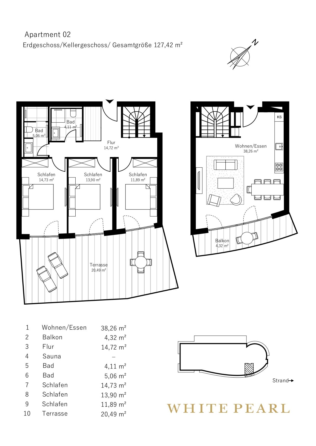 Die wundervolle Luxussuite 0.02 im "White Pearl" erstreckt sich über zwei Etagen und bietet Platz für 6 Personen auf 127 m² in strandnaher Lage.