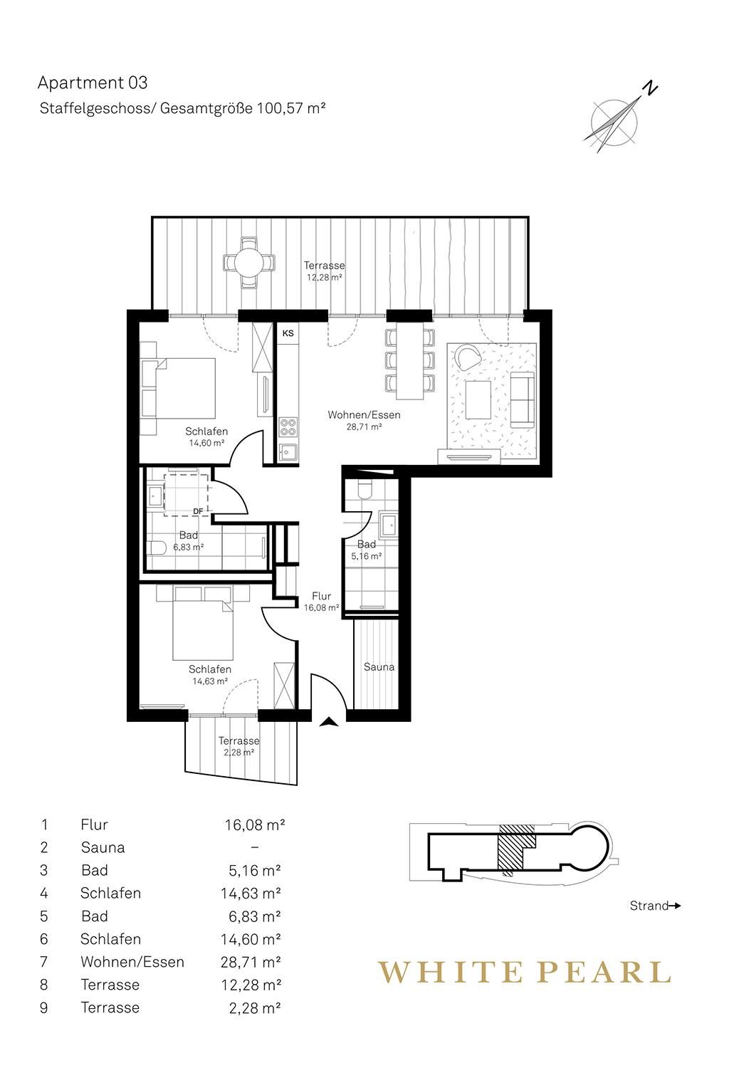 Das Luxus-Penthouse 4.03 befindet sich nur wenige Gehminuten von der Ostsee entfernt im vierten Obergeschoss des "White Pearl" und bietet auf 101 m² Platz für 4 Personen.
