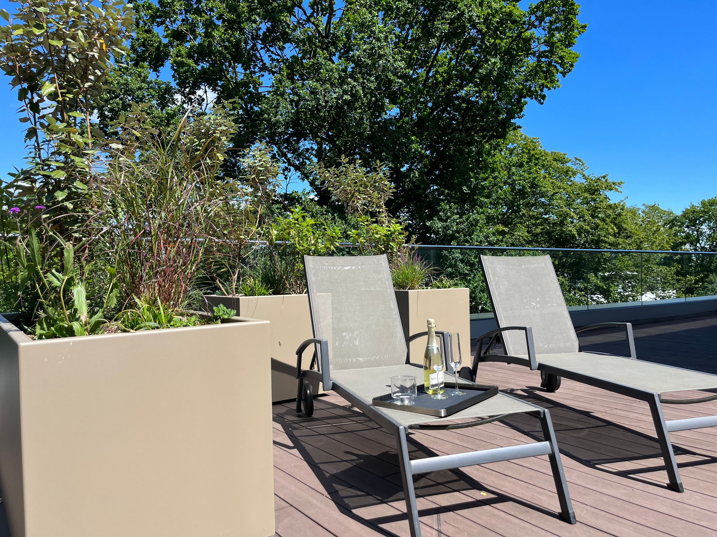 Das traumhafte Penthouse bietet einen lichtdurchfluteten Wohnbereich mit einer riesigen Fensterfront, der an die offene, voll ausgestattete Küchenzeile mit Kochinsel sowie an den Essbereich angrenzt. Das Sofa im Wohnbereich dient als Schlafmöglichkeit für zwei Personen. Weiterhin gibt es zwei separate Schlafzimmer, jeweils mit einem Boxspring-Doppelbett ausgestattet, und Zugang zur Dachterrasse, wobei ein Schlafzimmer direkt an ein Duschbad angrenzt. Ein weiteres luxuriöses Badezimmer mit Dusche rundet das Apartment ab.