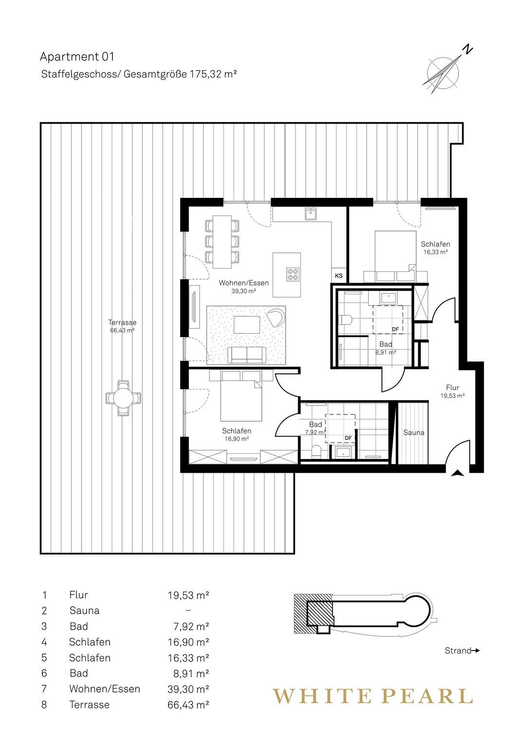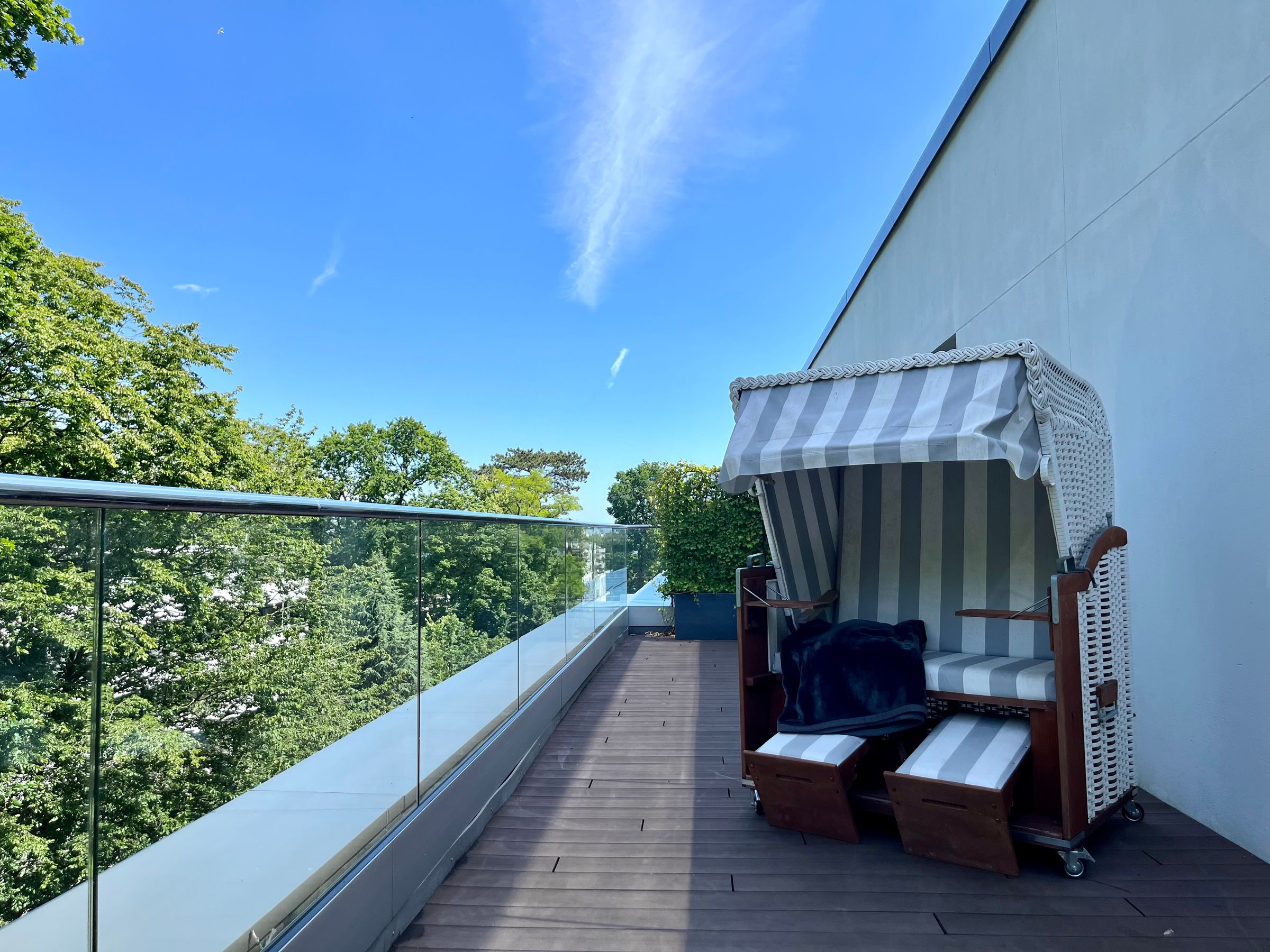 Zu den Highlights des Penthouses gehören eine eigene, gläserne Sauna (2,37m x 1,19m) sowie die herrliche, möblierte Dachterrasse mit Sonnenliegen und einem Strandkorb, die zu entspannten Stunden an der frischen Meeresluft einladen. Zur Wohnung gehört ein Tiefgaragenstellplatz. Unsere Appartements in der obersten Etage sind über die gemeinschaftliche Dachterrasse zu erreichen.