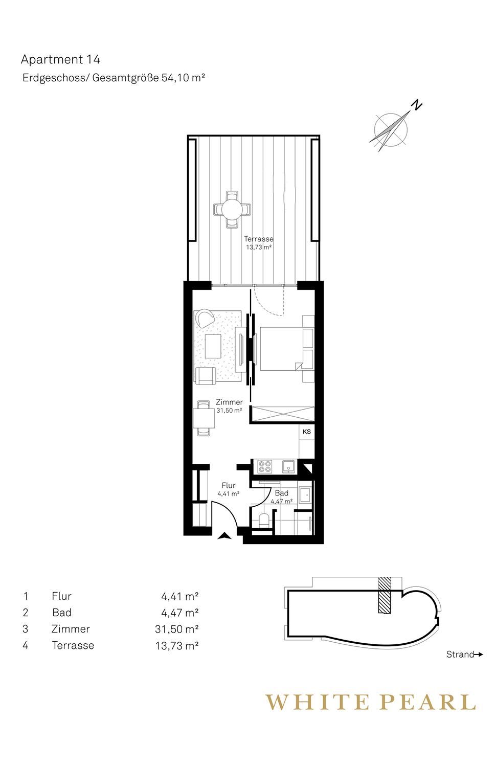 Wenige Minuten vom Strand entfernt befindet sich das Luxusapartment 0.14 im Erdgeschoss des "White Pearl" und bietet auf 54 m² Platz für 2 Personen.