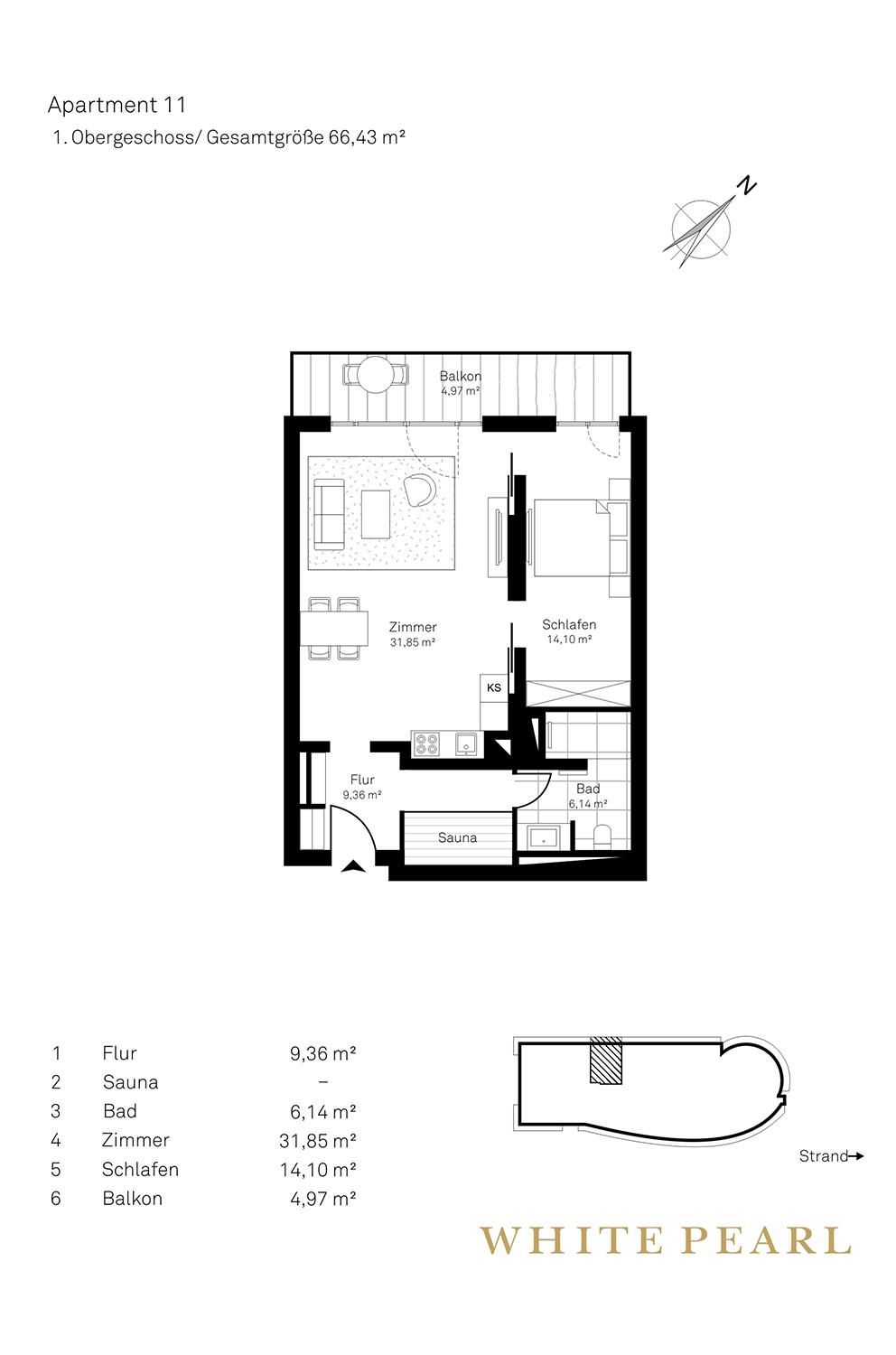 Zentral und strandnah gelegen befindet sich das Luxusapartment 1.11 im 1. Obergeschoss des "White Pearl" und bietet auf 66 m² Platz für 2-4 Personen. Das Apartment verfügt über ein separates, offenes Schlafzimmer sowie ein Schlafsofa im Wohnbereich für zwei Personen.