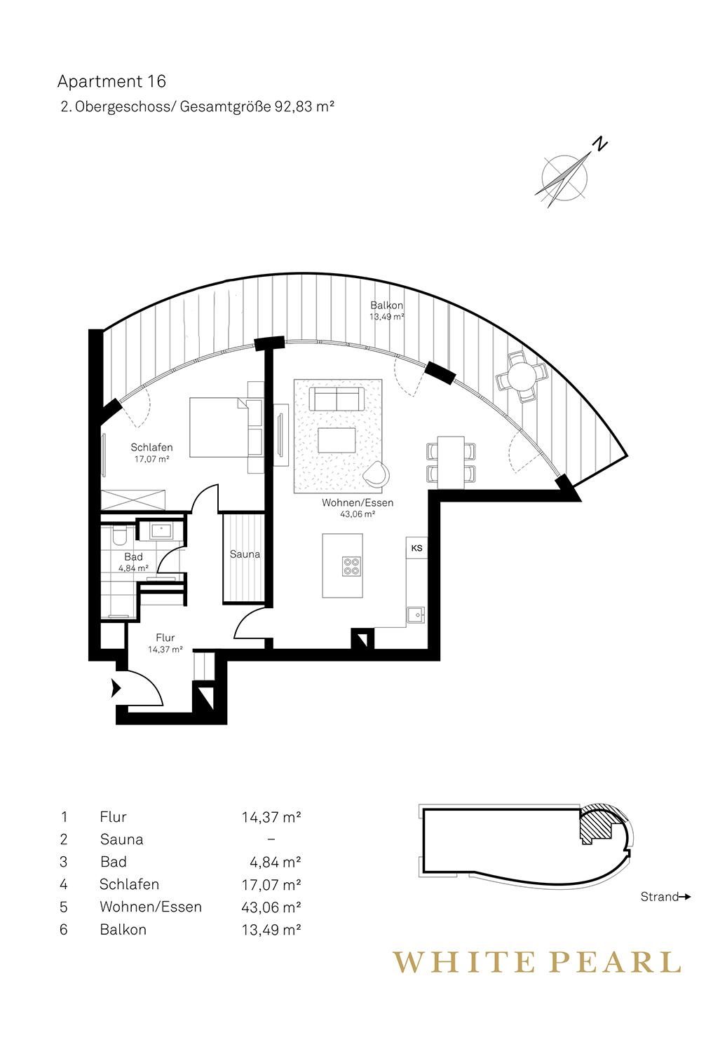 Nur wenige Meter vom Strand entfernt befindet sich das Luxusapartment 2.16 im 2. Obergeschoss des "White Pearl" und bietet auf 93 m² Platz für bis zu 4 Personen. Die Wohnung verfügt über ein separates Schlafzimmer sowie ein Schlafsofa im Wohnbereich für zwei Personen.