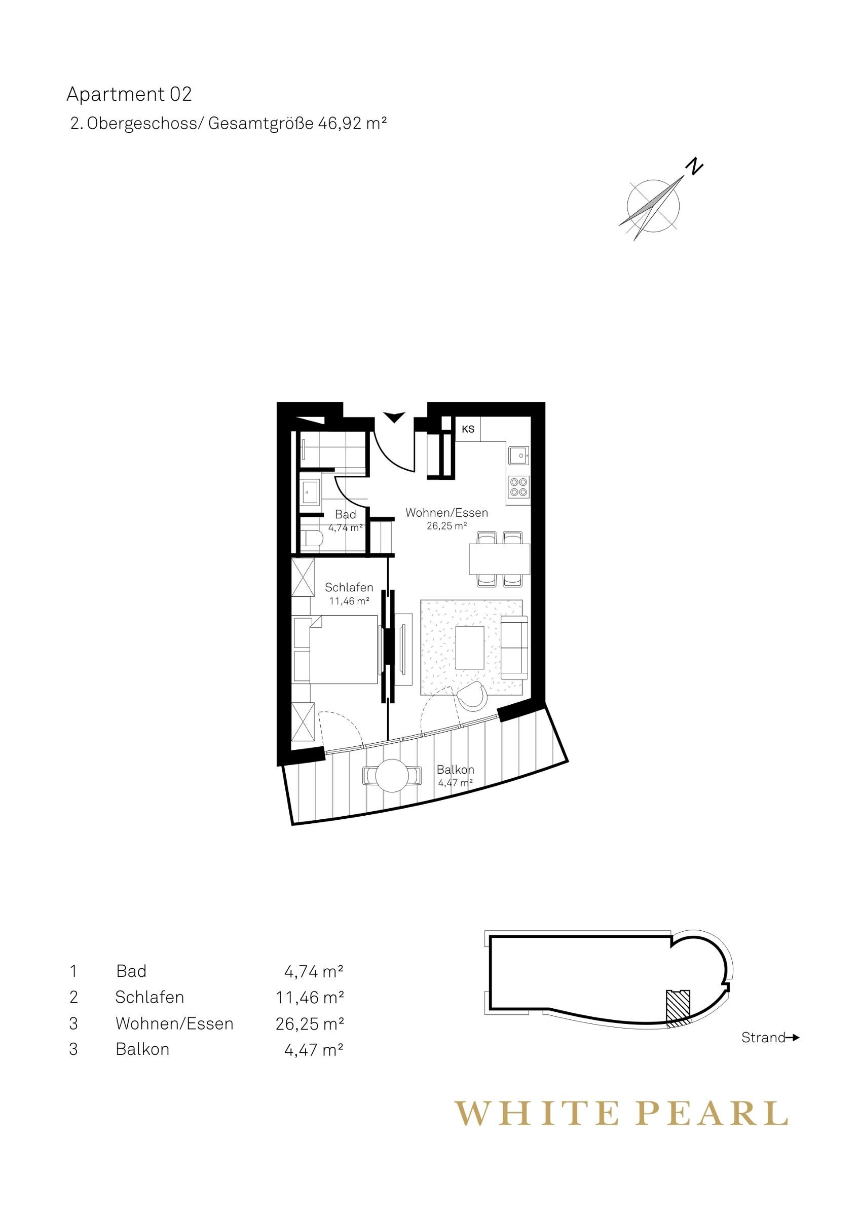 Nur wenige Meter vom Strand entfernt befindet sich das Luxusapartment 2.02 im 2. Obergeschoss des "White Pearl" und bietet auf 48 m² Platz für 2 (+2) Personen mit einem offenen Schlafzimmer und einer Schlafcouch im Wohnbereich für zwei Personen - auch Ihr Hund ist willkommen.