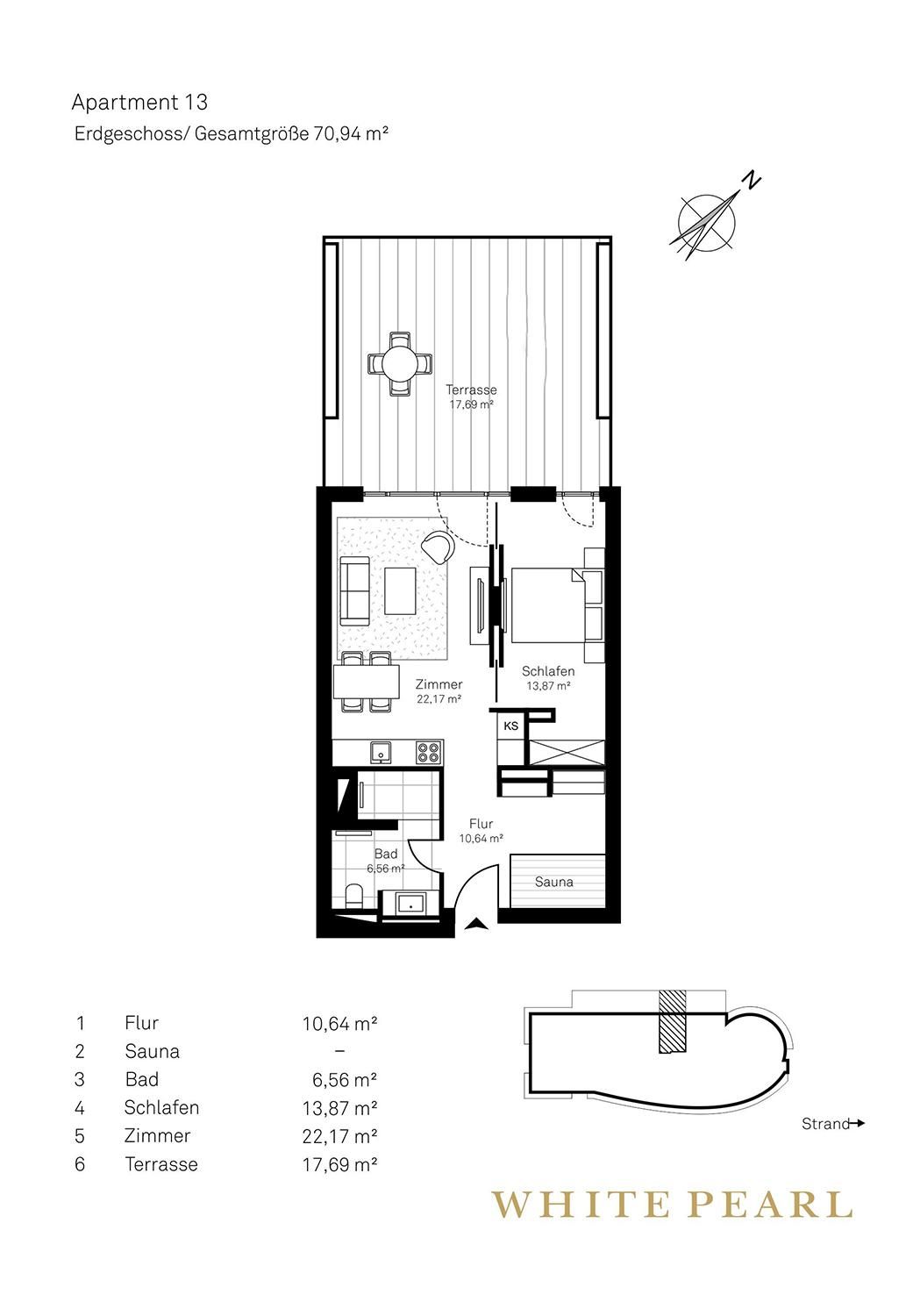 Die Highlights des Apartments sind die eigene Sauna (2,37m x 1,19m) sowie die möblierte Terrasse mit einem Strandkorb, die entspannte Stunden an der Meeresluft ermöglicht! Zur Wohnung gehört ein Außenstellplatz.