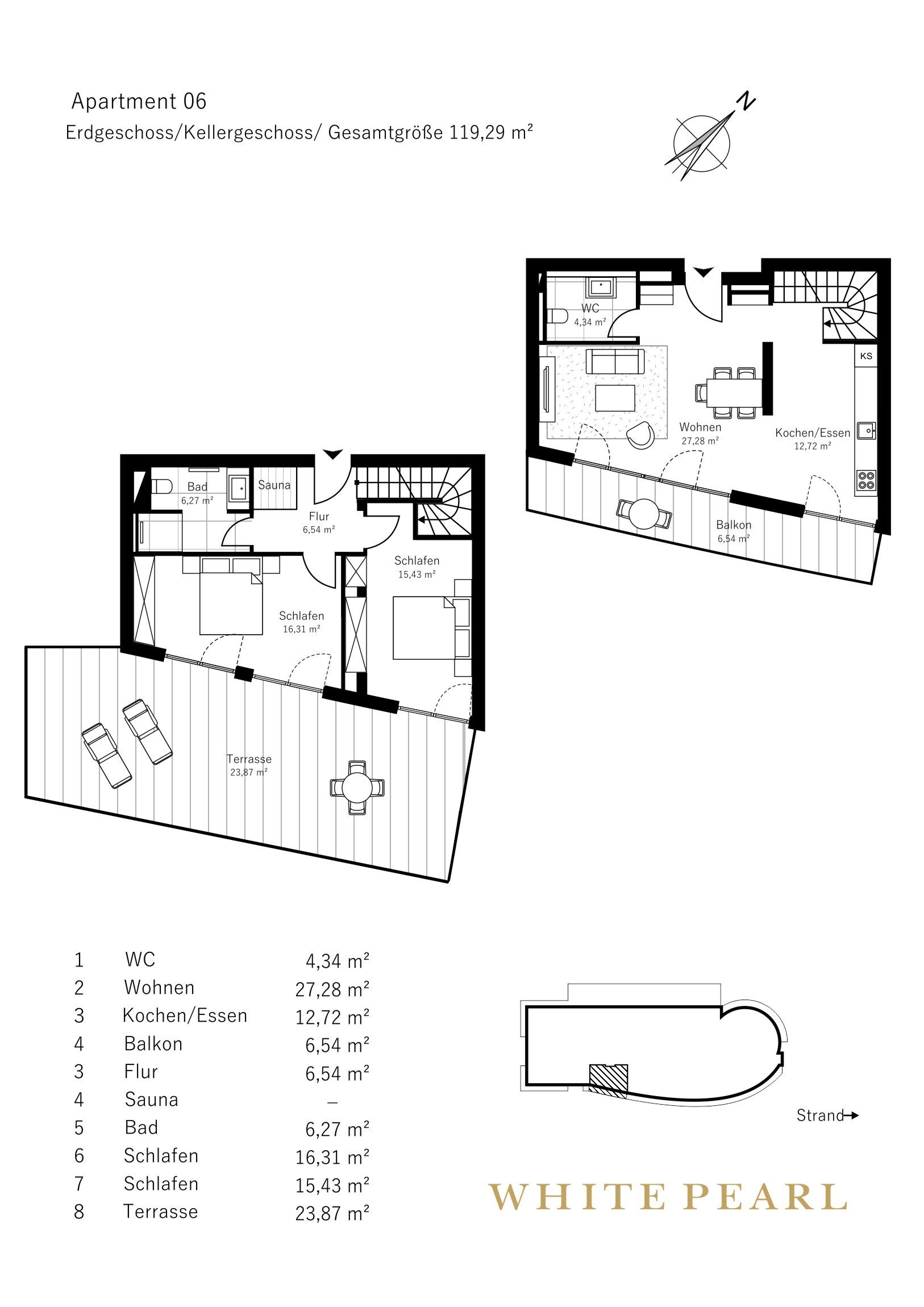 Die Luxussuite 0.06 im Erdgeschoss des "White Pearl" erstreckt sich über zwei Etagen und bietet auf 119 m² Platz für 5 Personen – auch Ihr Hund ist willkommen. Die Suite verfügt über zwei separate Schlafzimmer sowie ein Schlafsofa im Wohnbereich für eine Person.