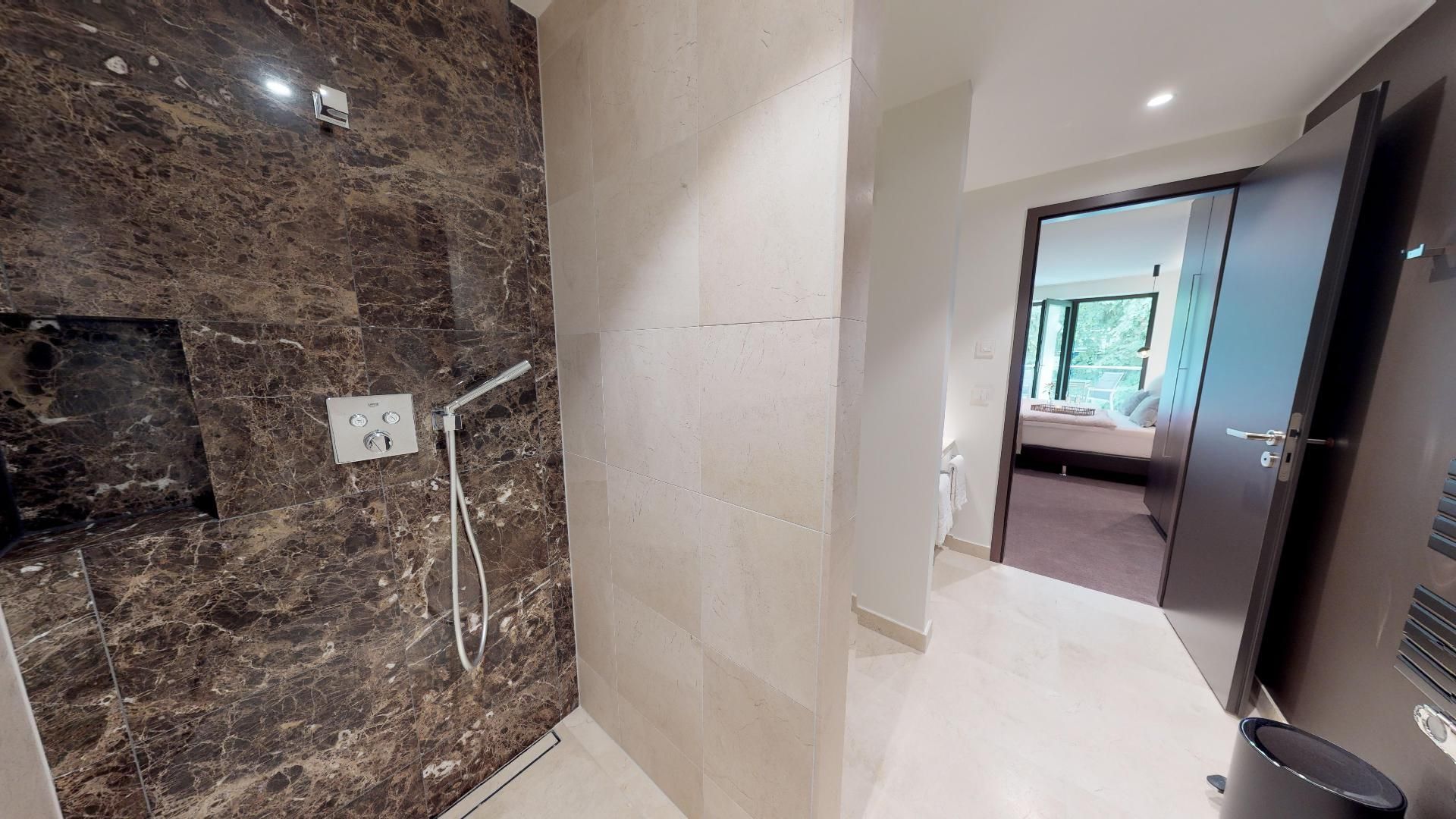 Highlights der Suite sind die eigene kleine Sauna (1,17m × 1,17m) sowie der möblierte Balkon, der zu entspannten Stunden an der frischen Luft einlädt! Zur Wohnung gehört ein Tiefgaragenstellplatz.