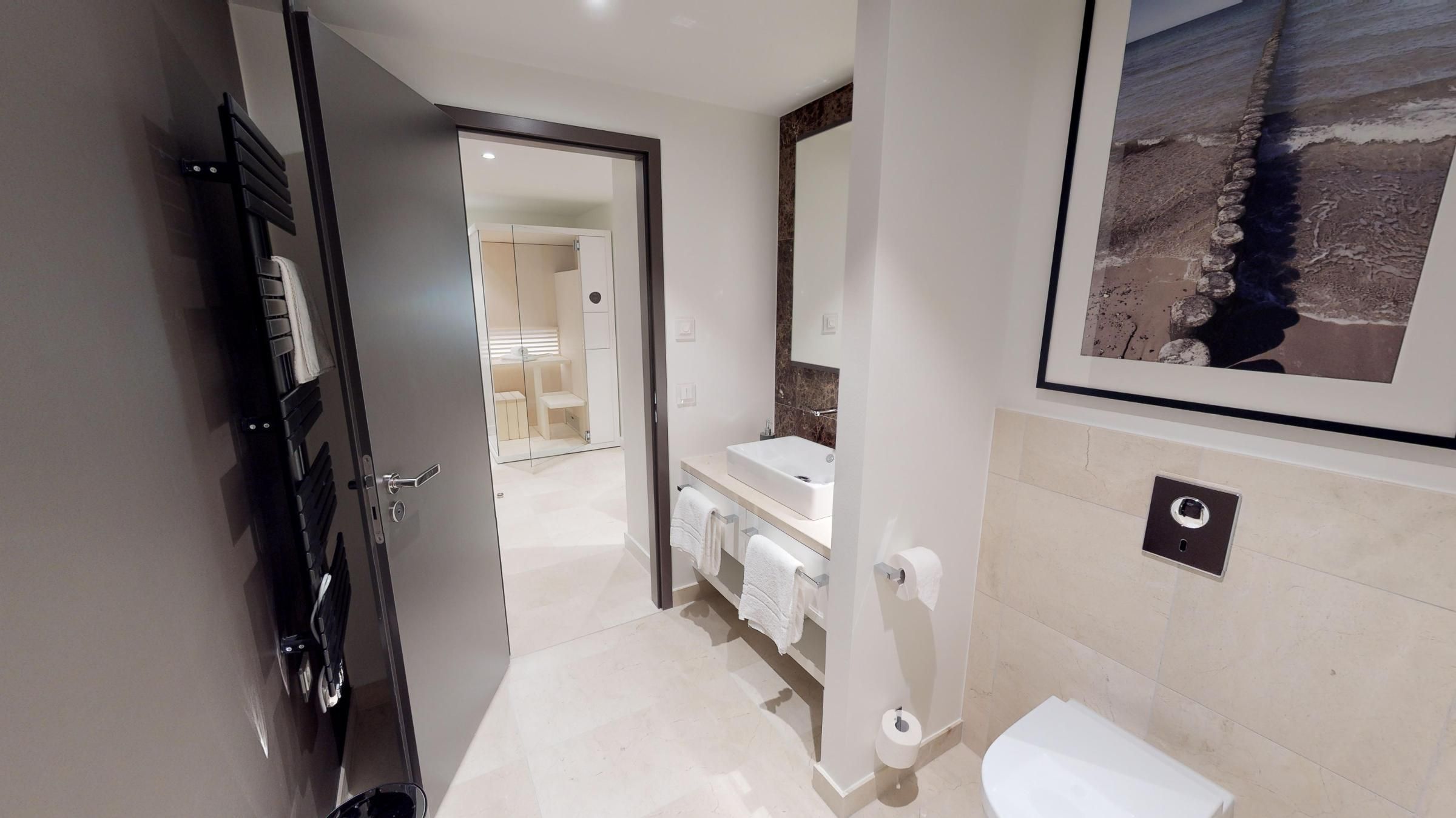 Highlights der Suite sind die eigene kleine Sauna (1,17m x 1,17m) sowie der möblierte Balkon, der entspannte Stunden an der frischen Meeresluft ermöglicht! Zur Wohnung gehört ein Tiefgaragenstellplatz.