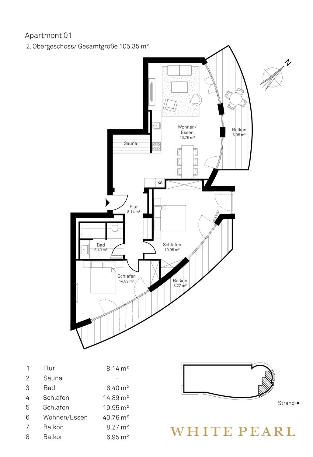 Nur wenige Gehminuten von der Ostsee entfernt befindet sich die Luxussuite 2.01 im 2. Obergeschoss des "White Pearl" und bietet Platz für 4 Personen auf 105 m².