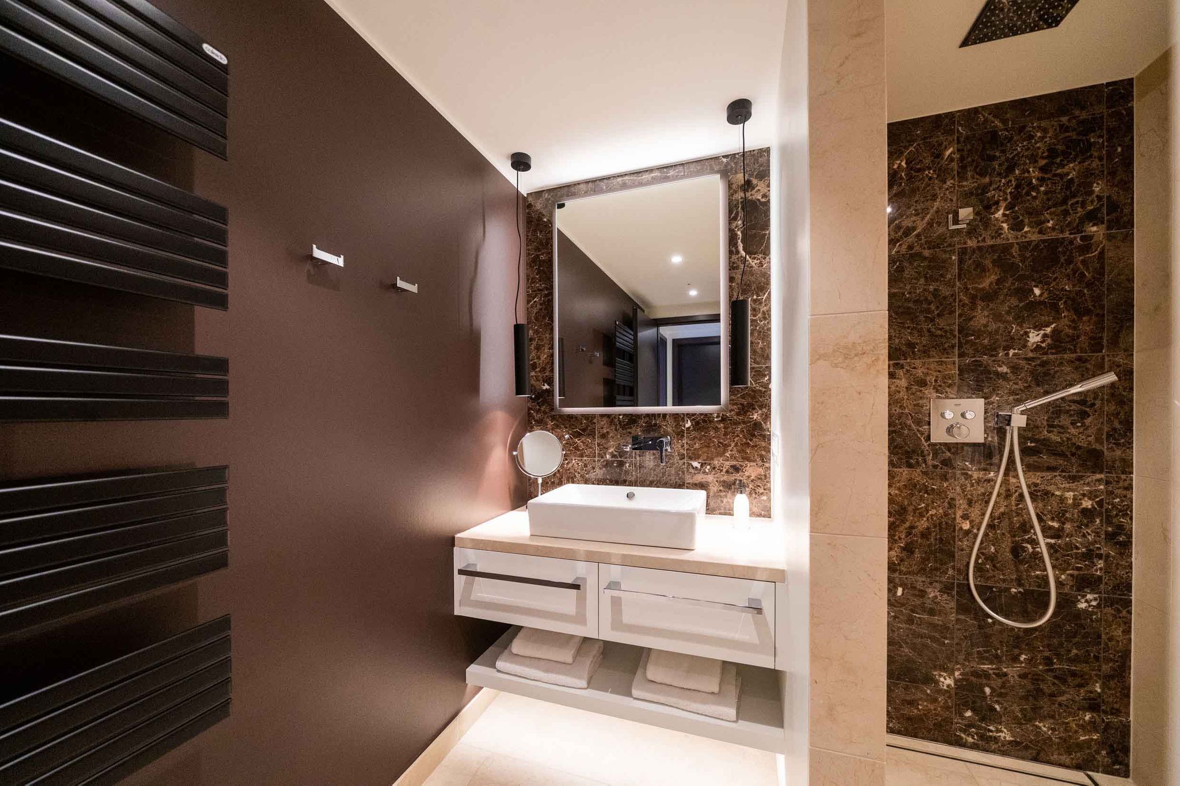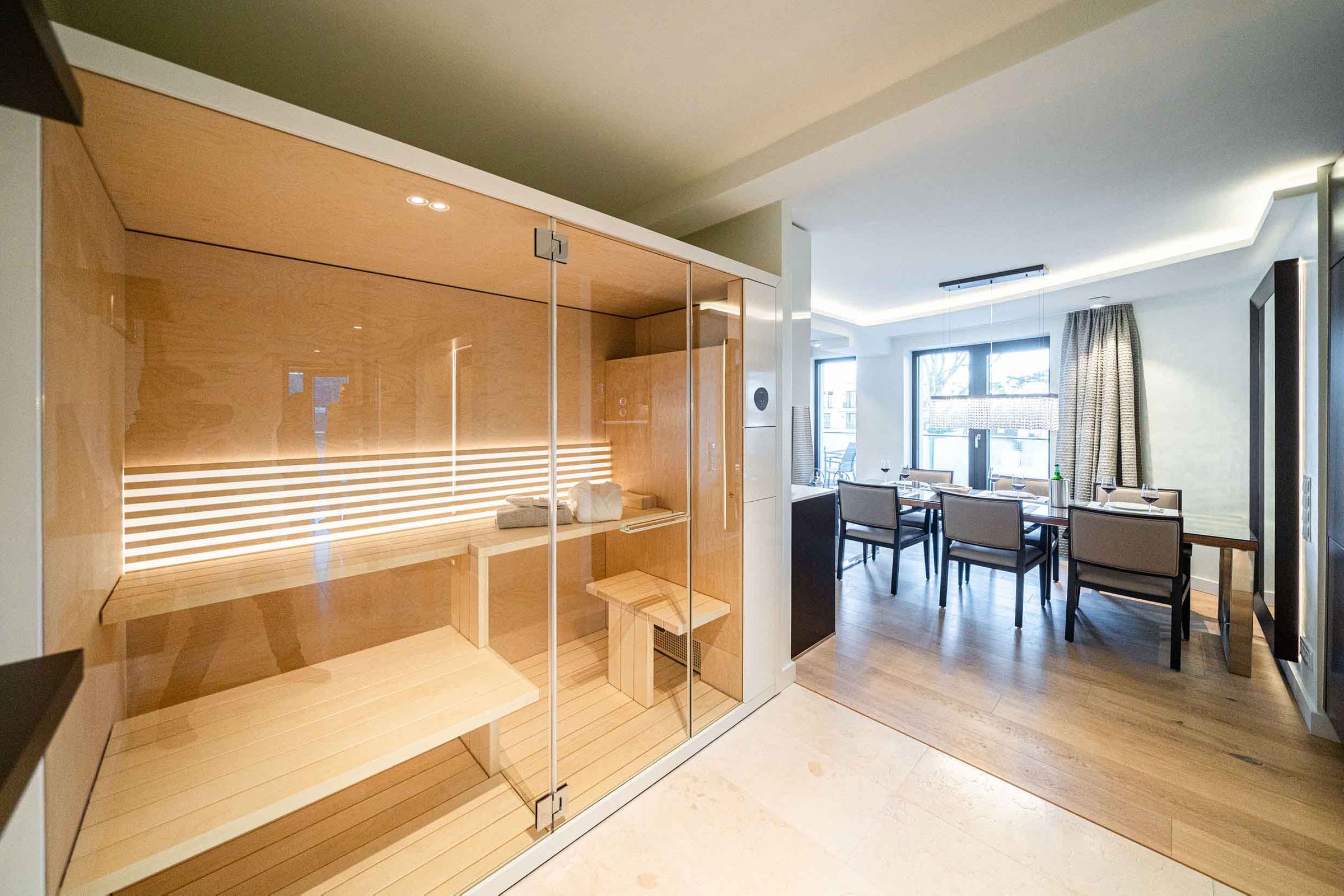 Zu den Highlights der Suite gehören eine eigene Sauna (2,37m x 1,19m) sowie der möblierte Balkon, der zu entspannten Stunden an der frischen Luft einlädt. Zur Wohnung gehört ein Tiefgaragenstellplatz.
