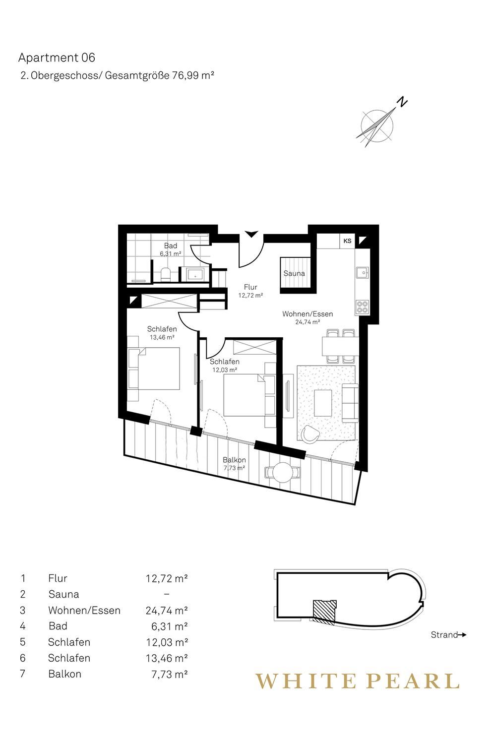 Die großzügige Luxussuite 2.06 befindet sich im 2. Obergeschoss des "White Pearl" und bietet Platz für 4 Personen auf 77 m² mit zwei separaten Schlafzimmern – auch Ihr Hund ist willkommen.