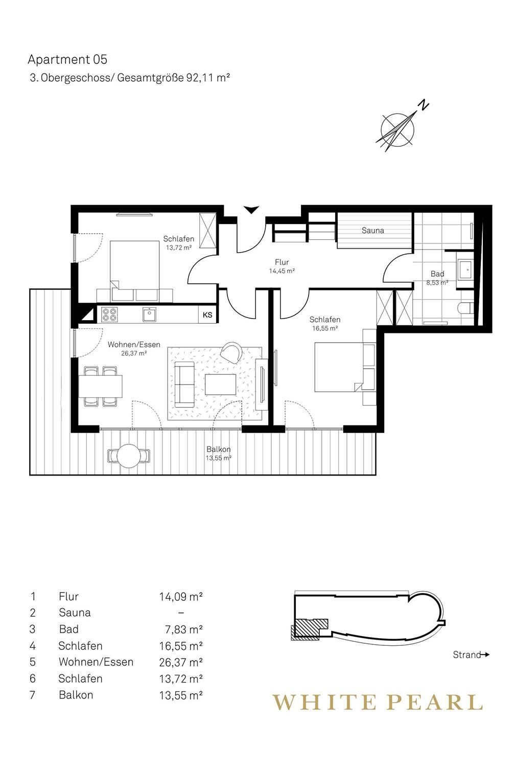 Nur wenige Gehminuten von der Ostsee entfernt befindet sich die Luxussuite 3.05 im 3. Obergeschoss des "White Pearl" und bietet Platz für 6 Personen auf 92 m². Es gibt zwei separate Schlafzimmer sowie ein Schlafsofa im Wohnbereich für zwei Personen.